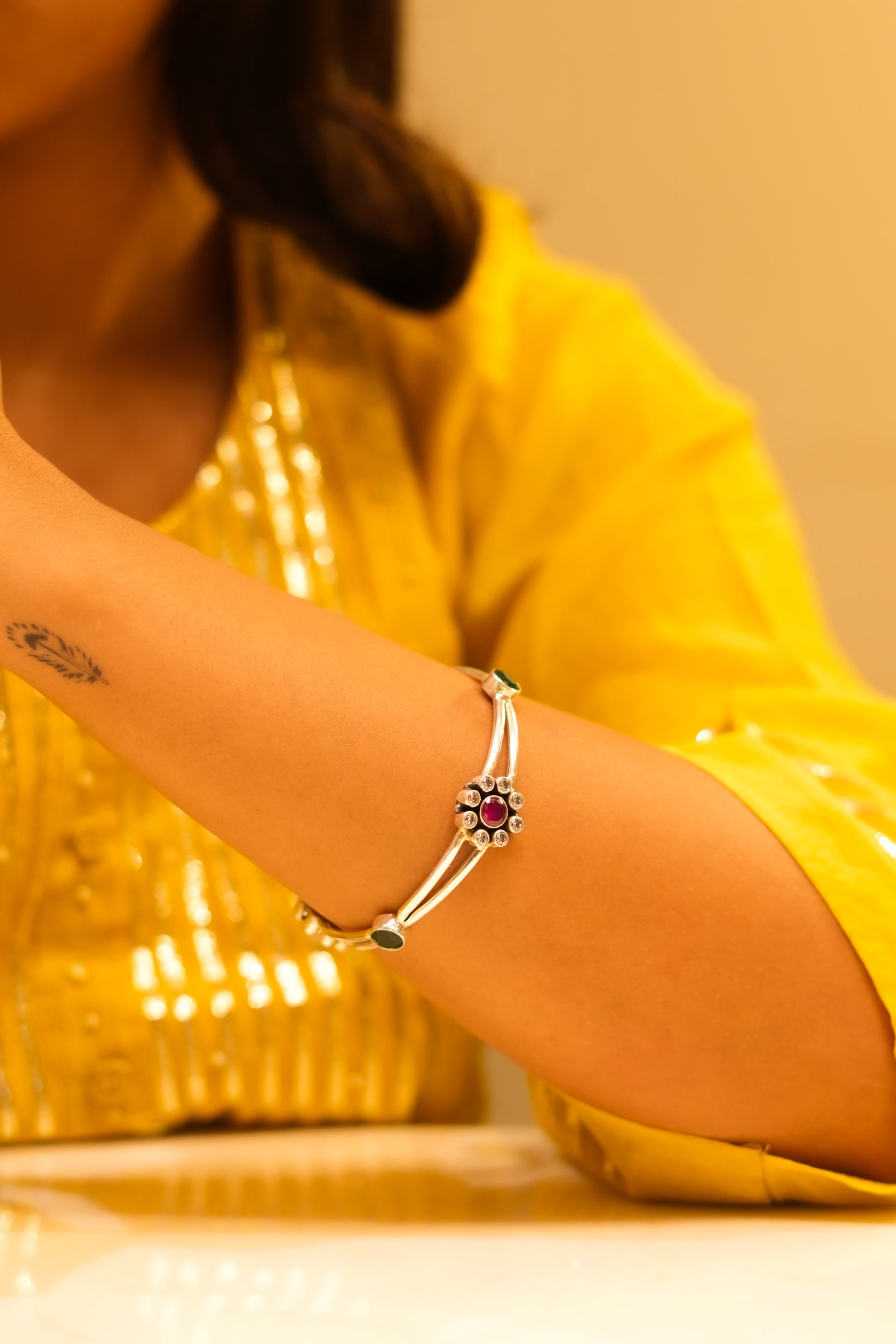 A handcrafted single 92.5 silver bangle featuring a unique double-layered design embellished with colorful gemstones, combining traditional flair with everyday sophistication.