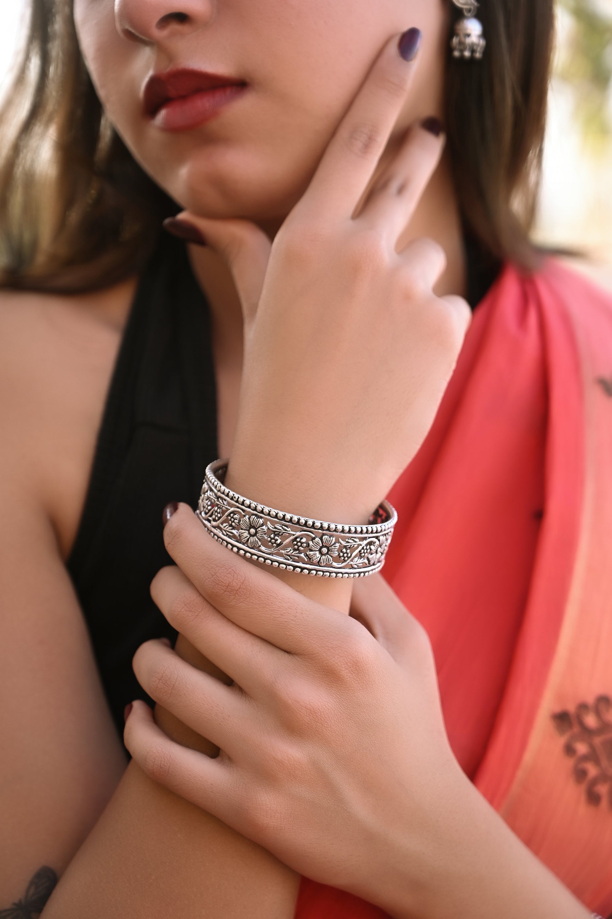 An ode to India’s classic artistry. This handcrafted single 925 silver bangle features ornate, intricate floral patterns framed by traditional beaded edges, reflecting vintage elegance.