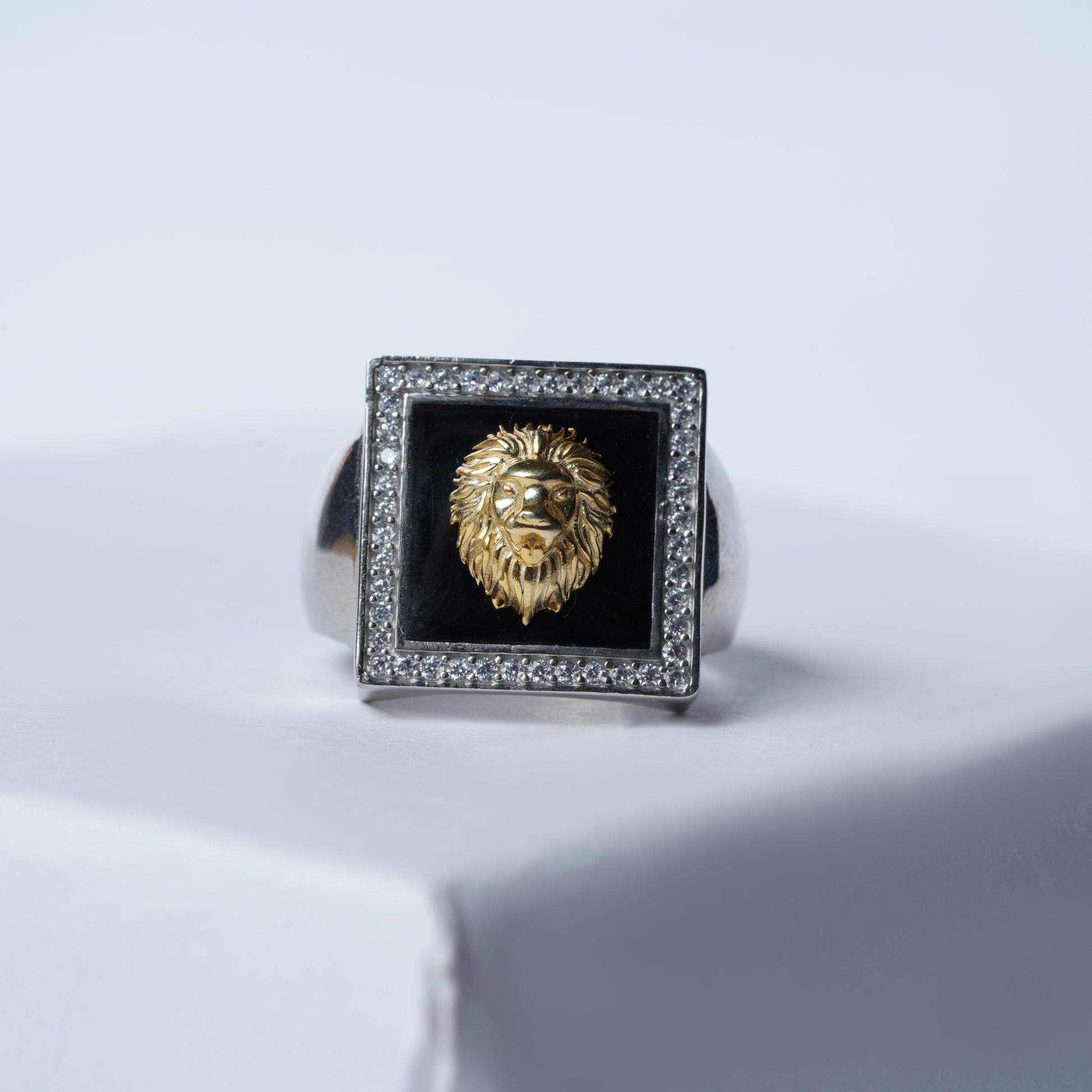 A commanding 925 sterling silver statement piece. Features a brilliant gold-tone lion head set against a stark black enamel background, encased in a silver square frame detailed with luminous diamond-like accents. Symbolizes fearless authority and modern strength.